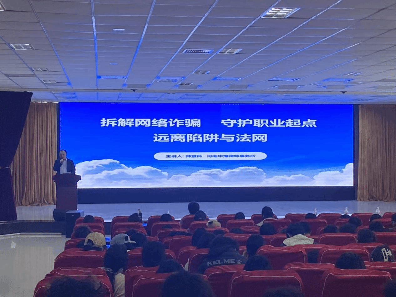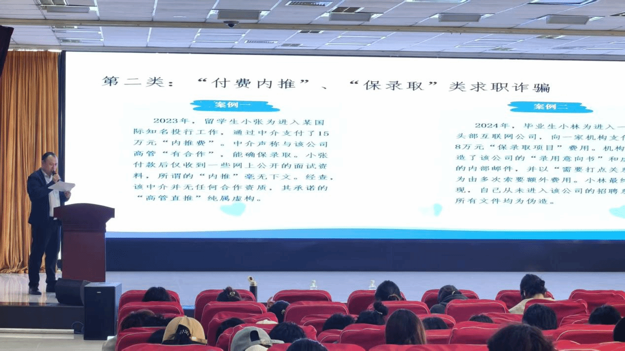 聘任仪式后,防诈讲座正式开讲。师律师以真实案例为切入点,聚焦校园及实习场景高发电信网络诈骗类型,精准拆解刷单返利、虚假招聘、培训贷等诈骗套路,用详实的案例还原诈骗全过程,以专业的法律视角剖析诈骗手段的隐蔽性与危害性,让在场学生直观认清诈骗陷阱。讲座内容紧密贴合实习学生生活实际,既有理论解读,更有实操指导,为即将步入实习的学子梳理清晰防诈思路,筑牢思想防线。