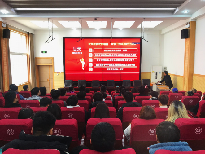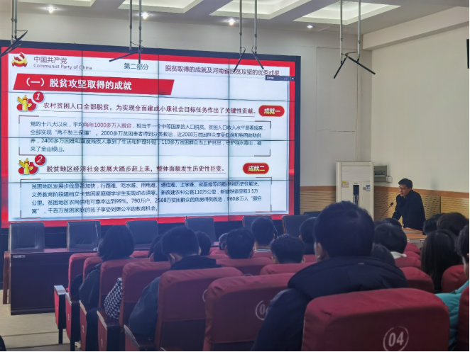 郑志宏以“发扬脱贫攻坚精神,做敢于担当的时代青年”为主题,围绕脱贫攻坚的背景和历程、脱贫攻坚取得的伟大成就、脱贫攻坚的重要经验、脱贫攻坚中的先进典型和重要事迹、脱贫攻坚的伟大意义等五个方面开讲。