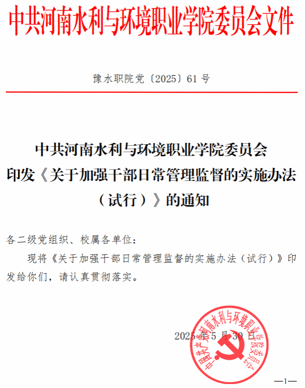 豫水职院党〔2025〕61号 印发《关于加强干部日常管理监督的实施办法(试行)》的通知