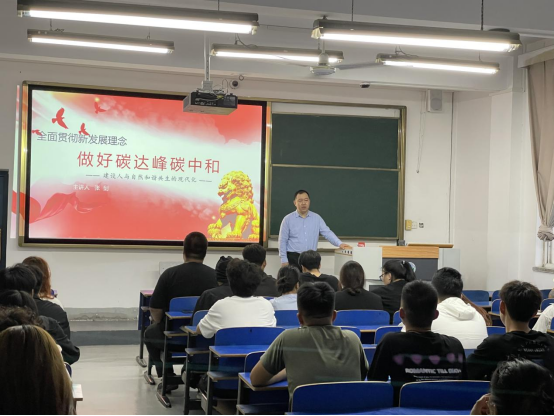 5月29日,谈球吧体育官网入口教师党支部书记、系主任张剑以《全面贯彻新发展理念做好碳达峰碳中和》为题,为教师党员及学生发展对象讲授专题党课。
