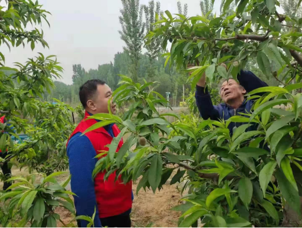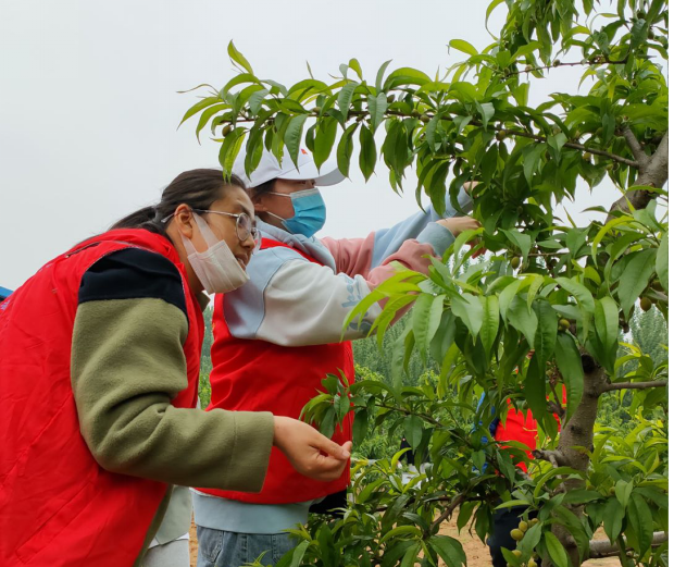 活动中,教师党员向果农讲解了果树疏果的原则、方法和注意事项,并进行现场演示。之后,学生志愿者和果农们一起为果树疏果。虽然当日小雨连绵,但是志愿者们干劲儿十足、热情高涨,高质量地完成了果树疏果工作。此次志愿服务活动,在为果农服务的同时,也让师生实践了果树疏果的技术,体验了劳动的艰辛。
