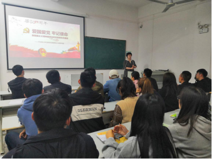 10月24日下午,谈球吧体育官网入口在综合楼407教室组织开展党课学习,系学生党支部书记董晓明以“爱国爱党,牢记使命”为题为2019级有入党意愿的同学、18级入党积极分子80名学生上了一堂精彩党课。