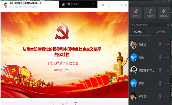 3月20日下午3点,谈球吧体育官网入口通过钉钉视频会议平台开展疫情防控专题“云党课”,学生党支部书记董晓明以“从重大疫情防控看党的领导和中国特色社会主义制度优越性”为题进行的线上党课培训,18级入党积极分子参加学习。
