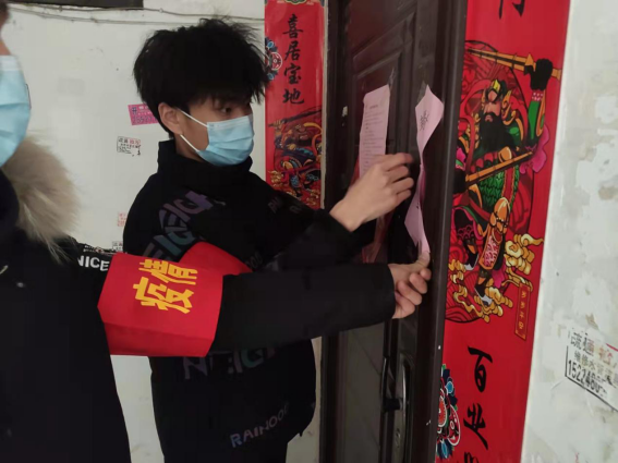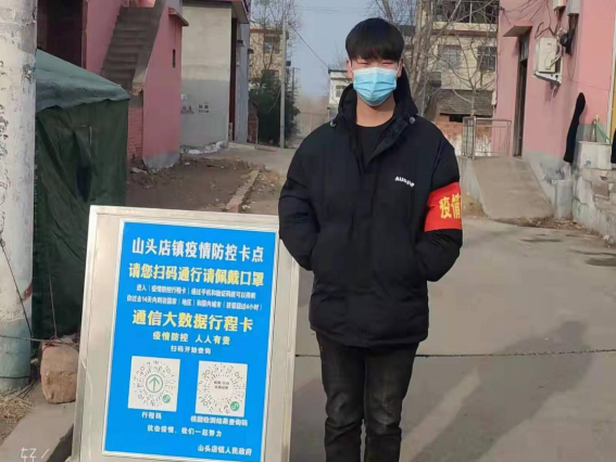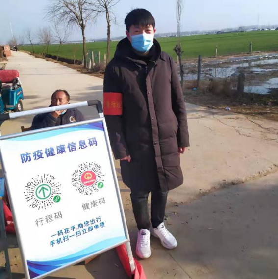 1月9日以来,20环艺2班陈紫阳在洛阳市洛宁县城郊乡崛东村担任疫情防控志愿者,主要负责检查来往车辆和行人的行程码、健康码,测量体温,返乡人员登记等工作。他说:“作为一名入党积极分子,我第一时间向村委会报名参加了疫情防控志愿服务工作。虽然天气寒冷,但是我认真把好疫情防控的每一关,坚持为村民守好疫情的安全防线。村民的热情配合和关切让志愿者们拥有更多热情,相信大家众志成城定能早日战胜疫情!”