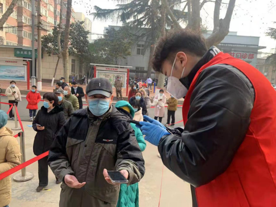 1月13日,21环艺1班学生李迎丽在郑州市二七区候寨滨河花园社区一期担任疫情防控志愿者,负责组织核酸检测队伍纪律,引导居民有序排队。她说:“身为共青团员和青年大学生,加入社区疫情防控志愿者服务团队、为人民服务是我应担的责任。青年有担当,国家才有希望。相信OO后也将成为服务祖国发展的中坚力量!”