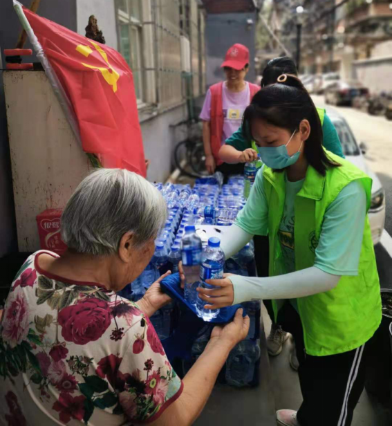 暴雨过后,郑州市大部分小区面临断电断水的困境。李慧颖同学自愿加入了郑州市金水区志愿者队伍,为防疫路附近的小区居民发放饮用水,用自身实际行动为抗洪救灾做出贡献。