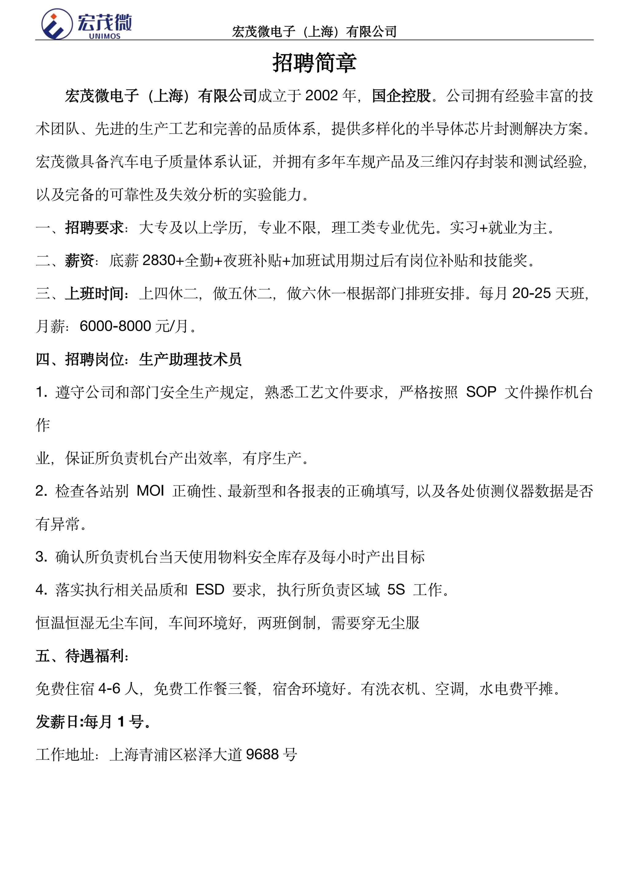 宏茂微电子(上海)有限公司招聘简章