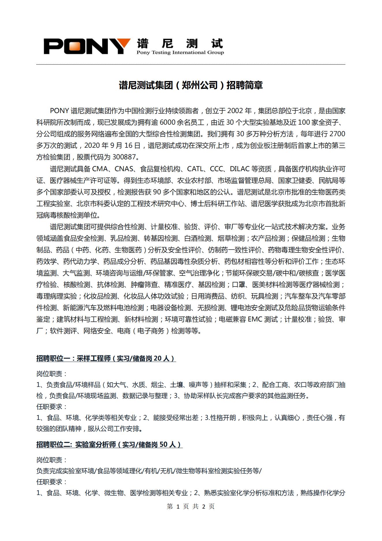 谱尼测试集团 (郑州公司) 招聘简章