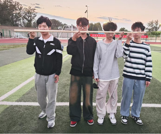 在接下来的齐眉棍项目中,小组成员站成两列,共同托住一根轻质塑料棍,并努力使其水平下移。这个项目不仅考验了同学们的沟通能力和默契程度,还让他们深刻体会到了团队合作的重要性。