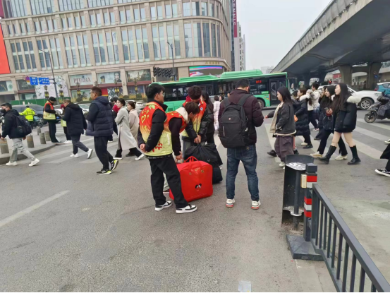 12名志愿者来到学校附近车流量密集的主干道,协助交警指挥交通,帮助行人提行李,引导老人安全过马路等,并化身文明交通劝导员,用自身行动倡导市民自觉遵守交通规则,文明出行。